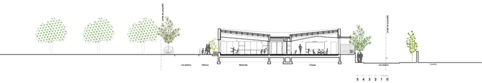Le projet propose de bâtir en rez-de-chaussée l'ensemble du programme autour de la cour de récréation. La cour se développe autour du platane existant qui permet d’apporter ombre et fraicheur à l’espace récréatif. Surélevée par rapport au terrain naturel afin de respecter les contrainte d’innondabilité de la parcelle, la cour et l’école est ainsi ouverte vers l’espace arboré et calme du cimetière, vers les champs et les alignements de platane à l’ouest.