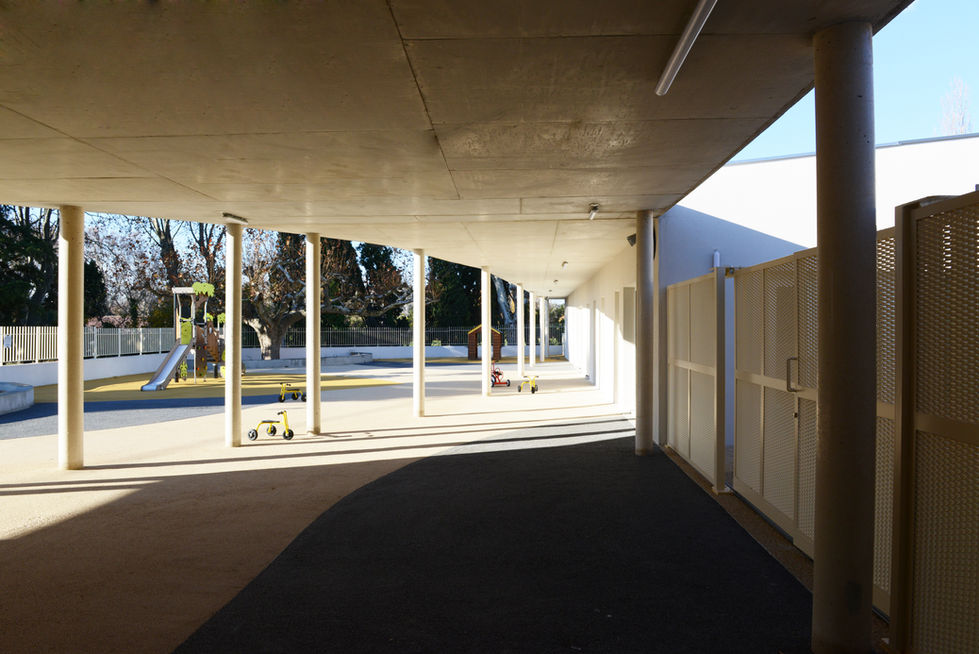 Le site d’intervention, offre un contexte typique des paysages des Alpilles, de ses montagnes de roche calcaire blanche et de ses champs d’olivier. L’école maternelle, livrée en Novembre 2017, se développe dans ce paysage rural, à proximité du centre de la commune, entre le cimetière et ses cyprès classés et de l’habitat individuel